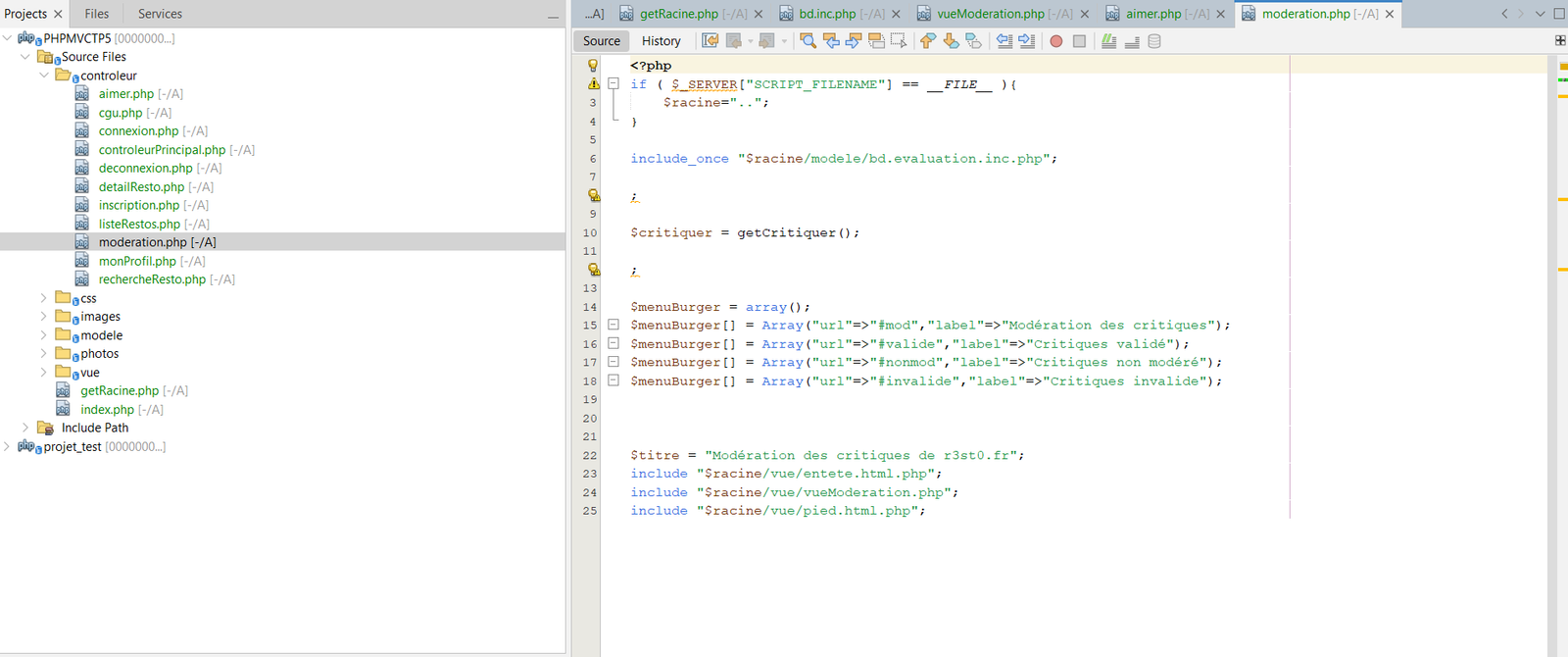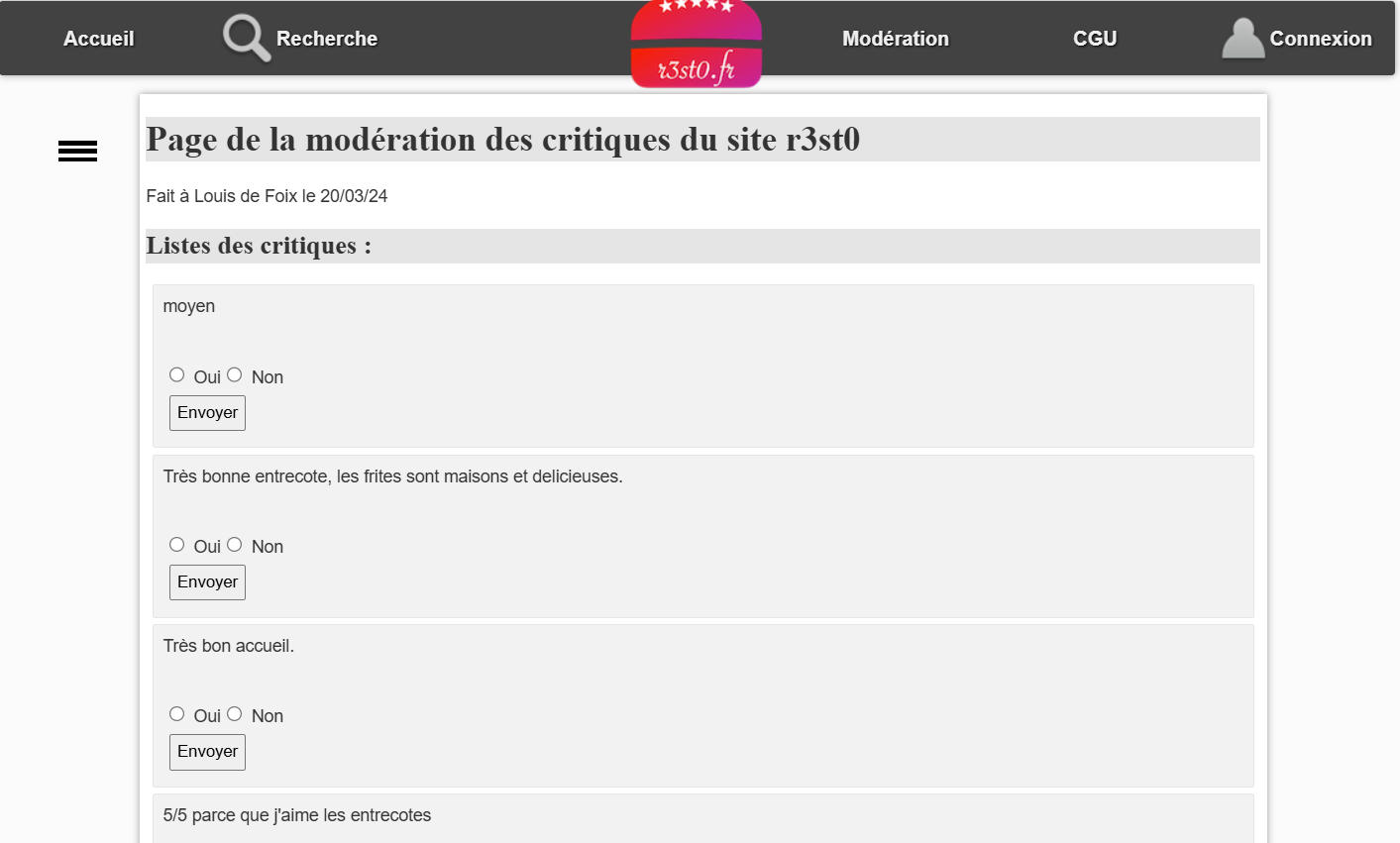 Les améliorations envisagées incluent la modération des critiques, des options de recherche avancées (par adresse et note) et l’accessibilité des photos pour les malvoyants. Le site a été développé en PHP avec l'architecture MVC, et chaque membre de l’équipe a pris en charge une fonctionnalité complète, de la création de la base de données au développement de l’application.